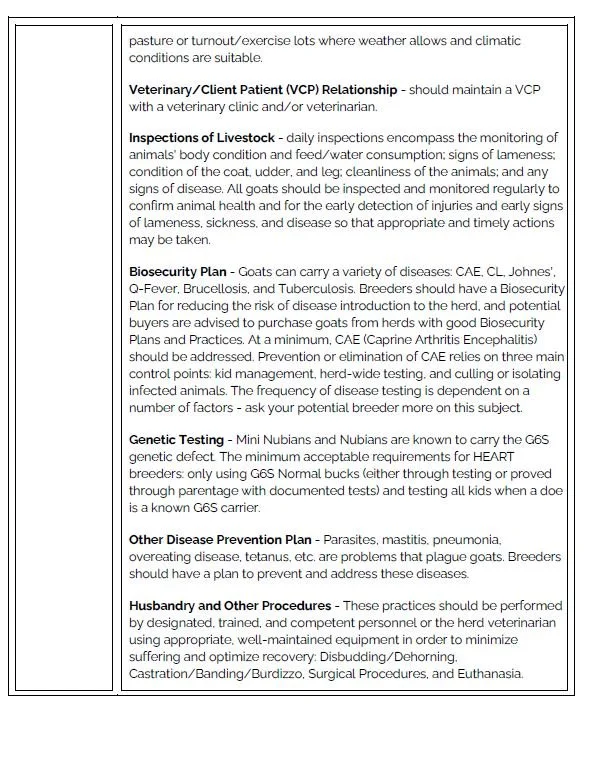 Text document discussing goat care guidelines. Topics include veterinary relationships, livestock inspections, biosecurity plans, genetic testing, disease prevention, and husbandry procedures. Mentions diseases like CAE and G6S, and outlines practices like disbudding and castration.