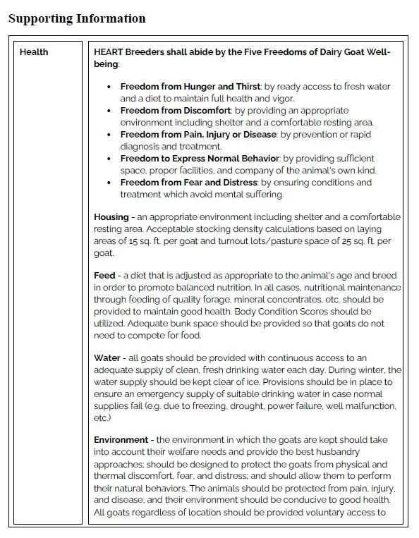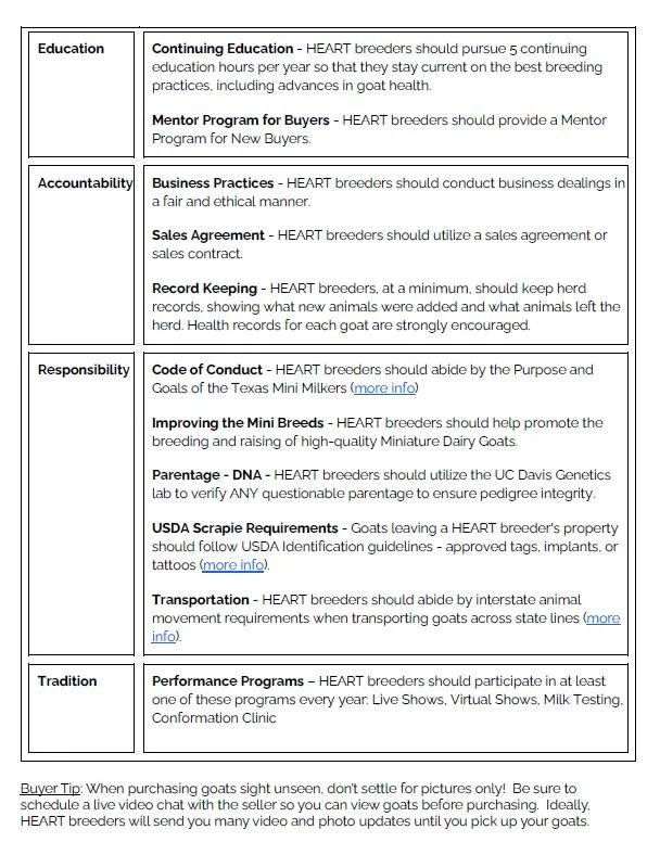 Guidelines for HEART breeders covering education, accountability, responsibility, and tradition. Includes continuing education, business practices, code of conduct, and performance programs. Encourages ethical breeding of Miniature Dairy Goats, maintaining records, and following USDA requirements. Advises buyers to schedule live video chats before purchasing goats.