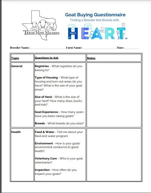 Goat buying questionnaire form from Texas Mini Milkers with sections on general information, health, and questions about registries, housing, herd size, goat experience, breeds, feed, water, environment, veterinary care, and inspection.