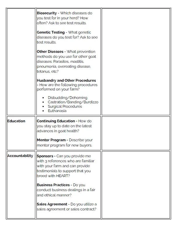 Questionnaire on goat health and farm management covering topics like biosecurity, genetic and other diseases, husbandry procedures, education, and business accountability, including continuing education, sponsor references, business practices, and sales agreements.